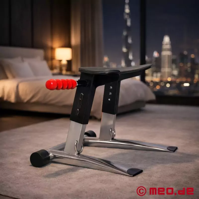 Crafted from stainless steel, the rimming seat has two sturdy, adjustable legs that allow you to find the perfect height for your pleasure. The ergonomically designed split seat provides maximum comfort and is upholstered. In addition, the rim seat comes complete with two handles for optimal control and positioning. The integrated D-rings on the frame offer exciting possibilities for incorporating BDSM gear into your play. It's time to take rimming to a whole new level of intensity!!!!