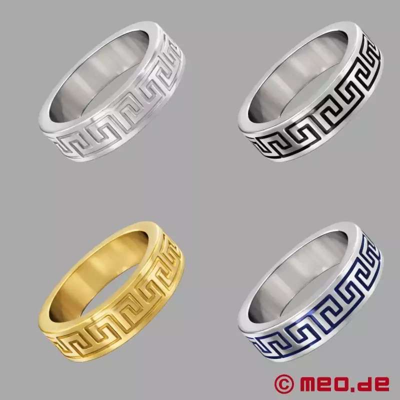 Το μοτίβο "La Greca" είναι ένα από τα πιο διάσημα στολίδια της αρχαίας Ελλάδας και μπορεί να βρεθεί ακόμα και σήμερα στην αρχιτεκτονική, την τέχνη και το ντιζάιν. Χαρακτηρίζεται από την αλληλένδετη, ορθογώνια ζώνη γραμμών - ισχυρή, γεωμετρική και διαχρονική. Σε φινίρισμα χρυσού χρώματος, το Cock Ring φαίνεται ιδιαίτερα πολυτελές, κομψό και παρόν.