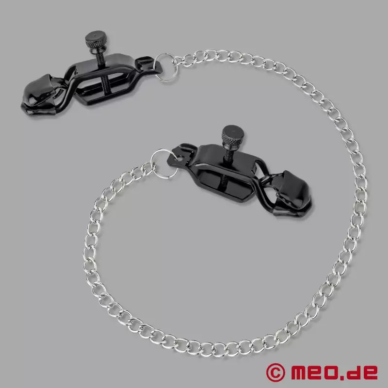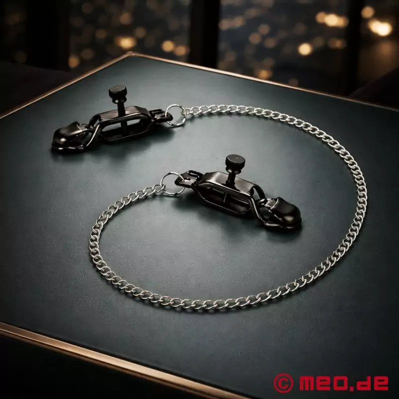 Τα δύο κλιπ για θηλές συνδέονται με μια ελαφριά ατσάλινη αλυσίδα που φαίνεται ισχυρή και είναι άνετη στη χρήση. Και αν θέλετε ακόμα περισσότερα Η αλυσίδα μπορεί εύκολα να αντικατασταθεί με μια πιο βαριά έκδοση ή να συνδυαστεί με πρόσθετα βάρη - για ακόμα πιο δυνατό τράβηγμα στις θηλές και πιο έντονη διέγερση.