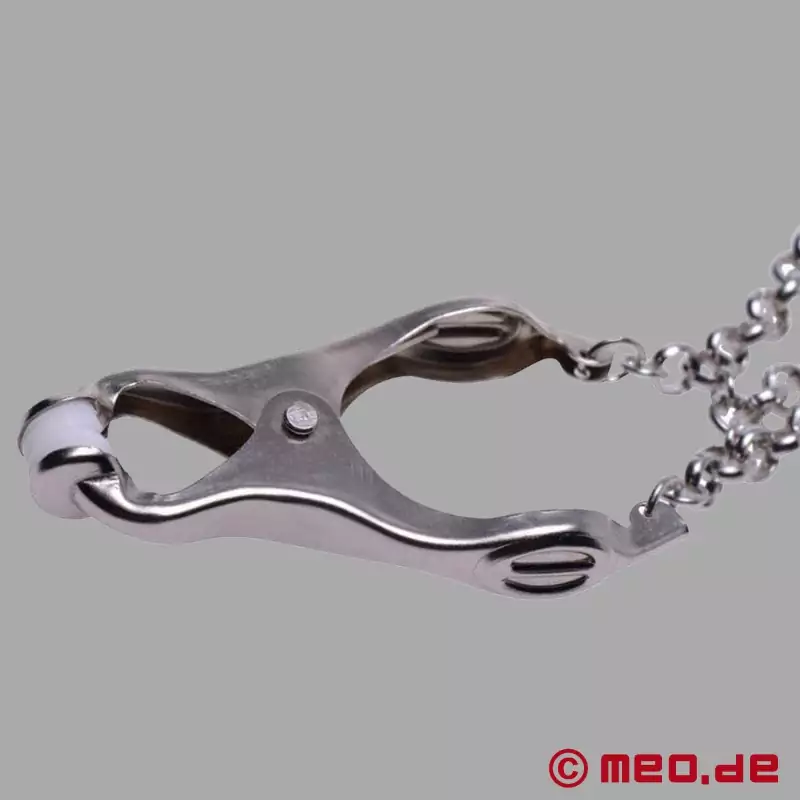 Αυτά τα κλιπ για θηλές θα διεγείρουν σταθερά και αμείλικτα τις θηλές του/της. Οι τρεις αλυσίδες παρέχουν πρόσθετο βάρος, ώστε να αισθάνεται πολύ καθαρά τους σφιγκτήρες στις σκληρές θηλές. Μπορείτε επίσης να τραβήξετε τις αλυσίδες ή να προσαρτήσετε πρόσθετα βάρη σε αυτές για να διεγείρετε τον υποτακτικό σύντροφό σας ακόμα πιο έντονα.