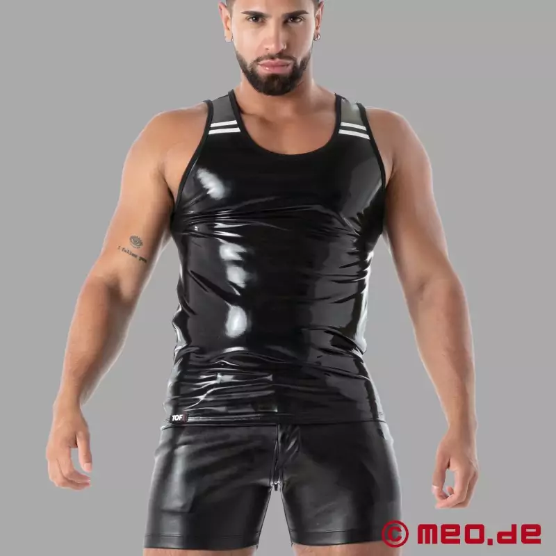 Σέξι, αστικό και αρρενωπό - το μαύρο Latex Tank Top από τη συλλογή SecondSkin™ αναδεικνύει ασυμβίβαστα το σώμα. Διαθέτει εξωτερικά μια γυαλιστερή εμφάνιση από λατέξ και εσωτερικά ένα ελαστικό μείγμα υφάσματος για στενή εφαρμογή. Οι λευκές πινελιές κάνουν μια σαφή, σπορ και γραφική δήλωση. The Latex Tank Top is ideal for clubwear and individual outfits. Αναπτύχθηκε και κατασκευάστηκε στο Παρίσι, Γαλλία.