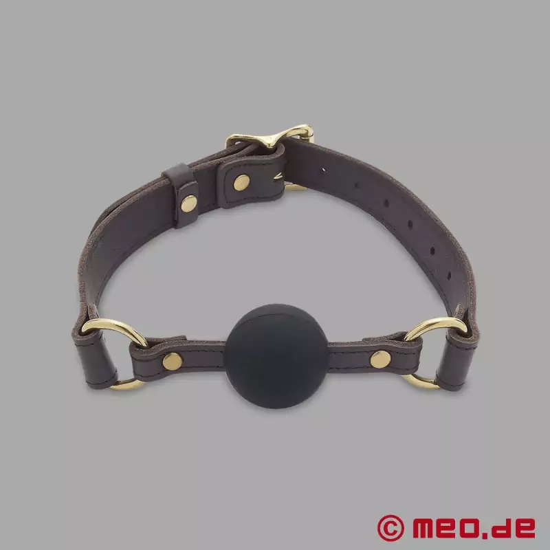 Ο σιλικονούχος και δερμάτινος φίμωτρο μπάλας είναι απλός στο σχεδιασμό αλλά εξαιρετικά αποτελεσματικός όταν πρόκειται να σταματήσει την περιττή φλυαρία. Χάρη στον ρυθμιζόμενο δερμάτινο ιμάντα, το φίμωτρο μπορεί να στερεωθεί ιδιαίτερα σφιχτά γύρω από το κεφάλι και εξασφαλίζει ότι ο υποτακτικός σύντροφος μπορεί να ηρεμήσει. Το δέρμα υψηλής ποιότητας είναι άνετο στη χρήση, ενώ οι στρογγυλεμένοι δακτύλιοι από ανοξείδωτο ατσάλι προστατεύουν τις γωνίες του στόματος. Η μπάλα της φίμωσης είναι κατασκευασμένη από ανθεκτική σιλικόνη και είναι αρκετά στιβαρή ώστε να αντέχει βαριά δαγκώματα χωρίς να καταστρέφει τη μπάλα της φίμωσης ή τα δόντια. Το κούμπωμα με αγκράφα διευκολύνει την προσαρμογή σε οποιοδήποτε μέγεθος κεφαλιού, ώστε το φίμωτρο να εφαρμόζει με ασφάλεια και να εκπληρώνει τη λειτουργία του ανά πάσα στιγμή.