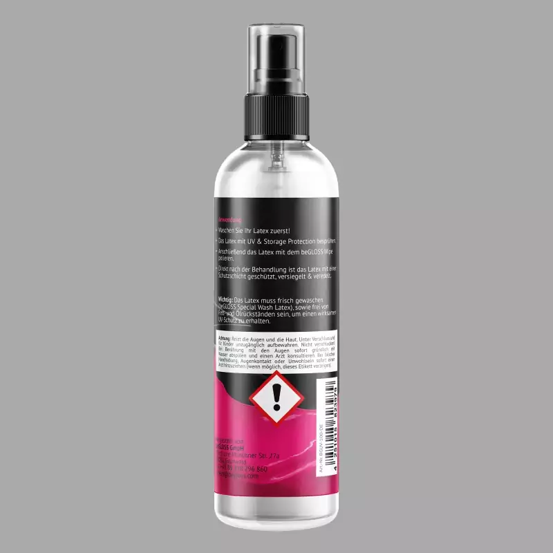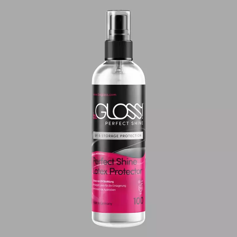 το beGLOSS® Perfect Shine™ σχηματίζει ένα προστατευτικό φιλμ που θωρακίζει τα ρούχα από λατέξ από τις ακτίνες UV και τα προστατεύει από βλαβερές επιδράσεις κατά την αποθήκευση. Αυτή η προστασία από την υπεριώδη ακτινοβολία και την αποθήκευση είναι ιδιαίτερα σημαντική το καλοκαίρι για τη μείωση του ξεθωριάσματος που προκαλείται από την ηλιακή ακτινοβολία και την προστασία του υλικού από το σκασίματα και τη φθορά.