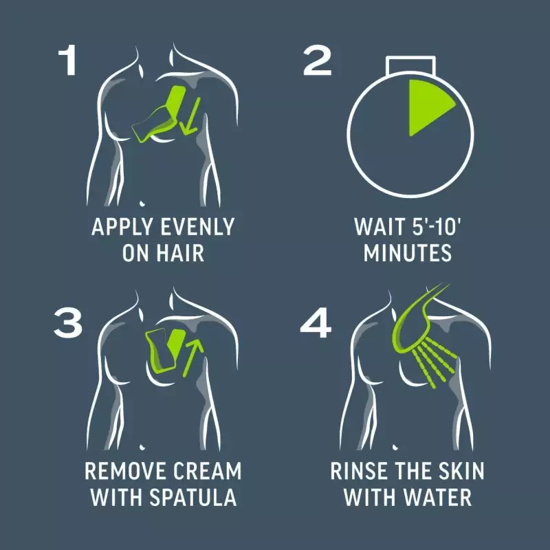 Διαβάστε και ακολουθήστε όλες τις σημαντικές οδηγίες πριν από τη χρήση. Εφαρμόστε την κρέμα ομοιόμορφα, ώστε να καλυφθεί πλήρως η τρίχα. Το αποτέλεσμα ξεκινά μετά από 3 λεπτά. Μετά από 3 λεπτά, δοκιμάστε μια μικρή περιοχή για να δείτε αν η τρίχα μπορεί ήδη να αφαιρεθεί. Εάν είναι απαραίτητο, αφήστε την κρέμα για μερικά λεπτά ακόμα, αλλά όχι περισσότερο από 6 λεπτά συνολικά. Στη συνέχεια αφαιρέστε την κρέμα και ξεπλύνετε καλά το δέρμα με νερό.