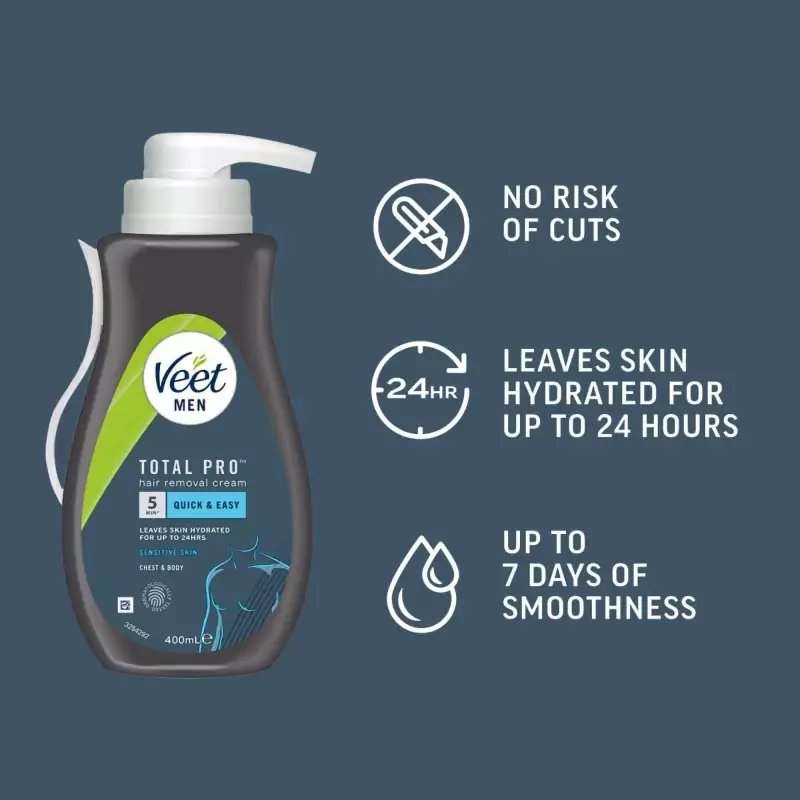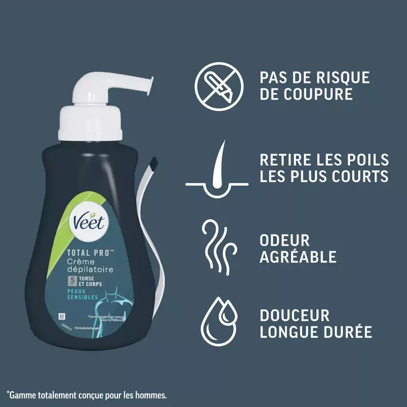 Η κρέμα αποτρίχωσης Veet Men Total Pro™ αναπτύχθηκε ειδικά για τις ανάγκες της ανδρικής επιδερμίδας και διατίθεται σε έκδοση 400 ml σε πρακτικό δοχείο. Αφαιρεί τις ανεπιθύμητες τρίχες του σώματος γρήγορα και αποτελεσματικά. Η κρέμα εξασφαλίζει αισθητά λείο δέρμα, ενυδατώνει για έως και 24 ώρες και επιτρέπει την αποτρίχωση στο πάνω μέρος του σώματος και στα πόδια χωρίς τον κίνδυνο κοψίματος, όπως μπορεί να συμβεί με το ξύρισμα.