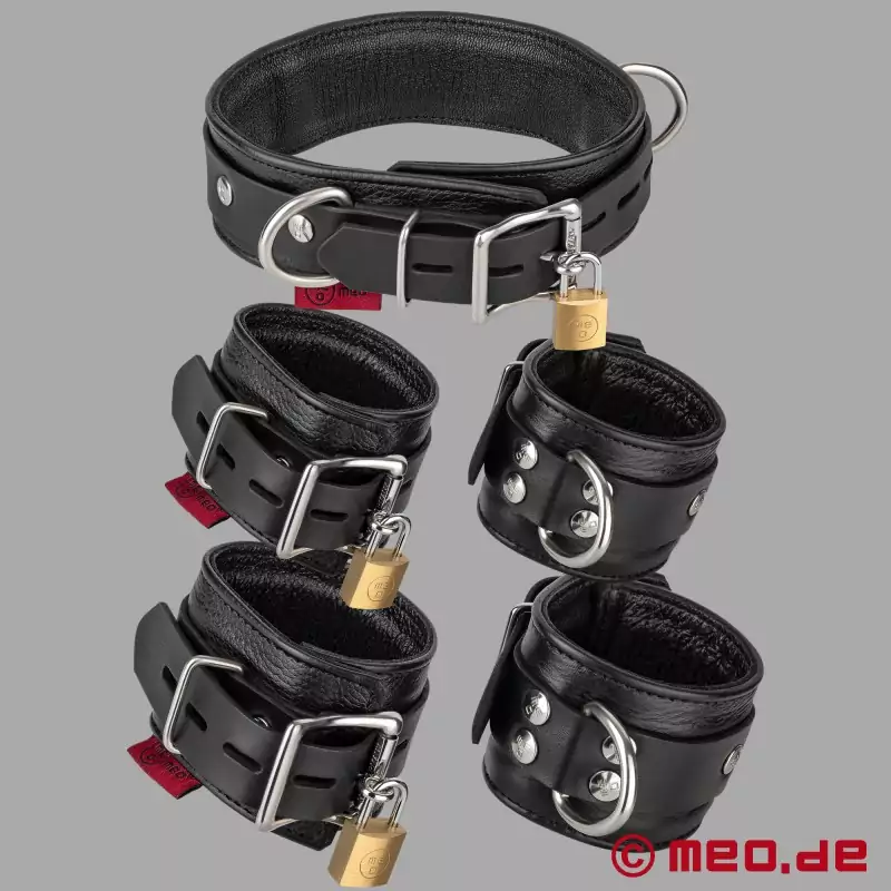 Όλα τα στοιχεία αυτής της έκδοσης είναι κατασκευασμένα από προσεκτικά επεξεργασμένο, λεπτόκοκκο δέρμα που είναι ευχάριστο στην αφή και ανθεκτικό. Η επένδυση εξασφαλίζει τέλεια, στενή εφαρμογή που παραμένει άνετη ακόμη και μετά από παρατεταμένη χρήση. Τα λουκέτα με το ίδιο κλειδί έχουν το πλεονέκτημα ότι όλες οι κλειδαριές μπορούν να ανοίξουν με ένα μόνο κλειδί. Αυτό είναι ιδιαίτερα πρακτικό όταν χρησιμοποιούνται ταυτόχρονα χειροπέδες, χειροπέδες ποδιών και το κολάρο.